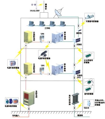 3)大楼或机房的电源线和通信线等在大楼外受直击雷或感应雷而加载的雷电压及过电流沿线窜入,入侵电子设备。