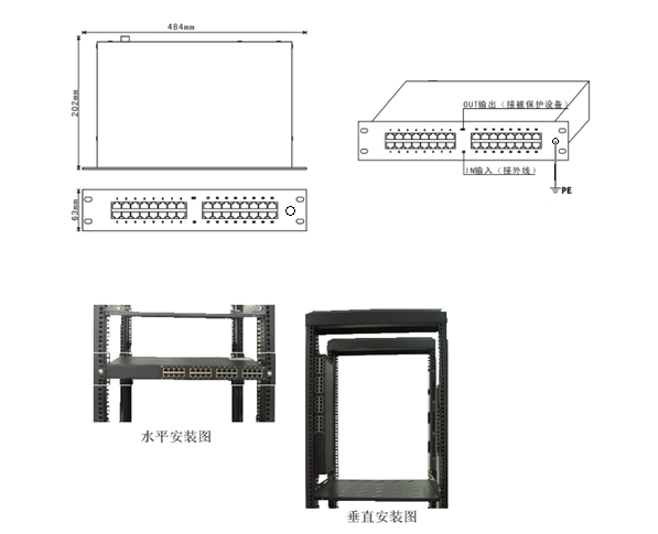 安装时注意线缆进出方向,有“IN”和“OUT”标志。“IN”始终为非保护侧,并指示过电压可能产生的方向、保护侧“OUT”指向被保护区域或设备,通过接地导线进行等电位连接,安装时应尽量靠近被保护设备可方便安装在15/35mm标准导轨上,产品仅有一个垂直单位高度(1U),占用空间少,并通过90°、180°和270°旋转安装支架,支持多种水平和垂直安装方式,特别适合安装于19″机柜内。安装时注意进出电涌保护器的线缆应分开走线,以免出现电涌的二次耦合。