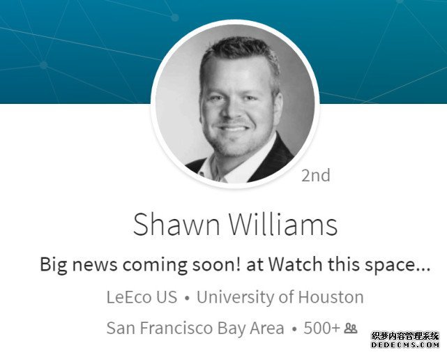 腾讯科技近日发现,乐视高级副总裁、乐视美国首席行政官Shawn Williams的Linkedin页面最新显示为,其在乐视的工作时间起止日为2016年1月至2017年3月,其个人简介也显示为“关注该页面,即将有大新闻发生”(”Big news coming soon! at Watch this space...”)