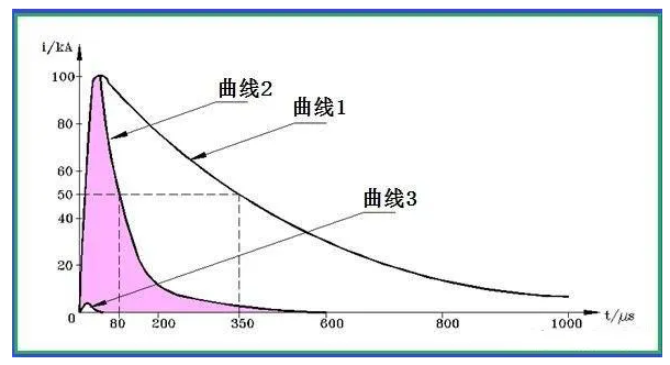 曲线1被称为冲击电流Iimp,其波头时间为10μS而半峰时间为350μS 。由于曲线1很接近自然雷电放电的电流波形,常用于一级配电。曲线3用于二级和三级配电的电气电子系统。