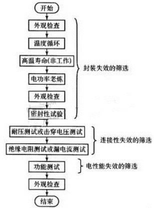 按照原则排序后,还加上一次外观检查,主要是为了防止测试筛选过程中由于在不同实验室之间转运而发生外观破损等现象,保证检验结束后的元器件外观合格。这样就得到图1所示的筛选工作流程图。